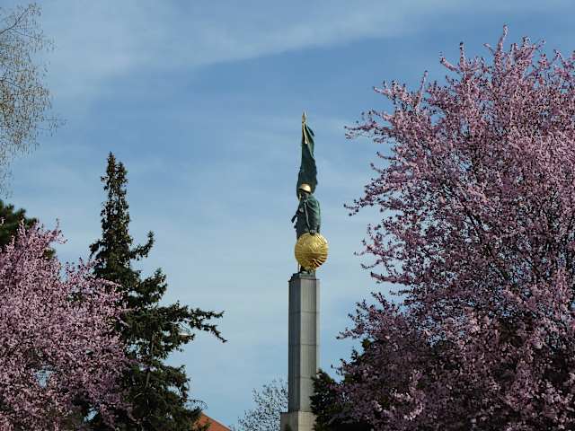 Uns wurde der Blick auf das Palais Schwarzenberg durch das Befreiungsdenkmal eingeschränkt. Hier erhebt sich ein Soldat der Roten Armee 20 m in die Höhe umgeben von einem Halbkreis aus Säulen. Man fühlt sich in den Ostblock versetzt, dort erwartet man solche Symbole. Aber im Sonnenschein wirkt der Soldat mit dem goldenen Schild und der Fahne hoch oben auf dem Sockel. Als Erinnerung Befreiung durch die Rote Armee wurde das Befreiungsdenkmal durch die Sowjets an den Beginn des Rennwegs auf den Schwarzenbergplatz platziert. Von Metternich kommt die Aussage „Am Rennweg fängt der Orient an“