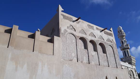 Der riesige Palast von Scheich Isa bin Ali befindet sich auf der Insel Muharraq entweder am Anfang oder am Ende des Perlenpfades, je nachdem von welcher Seite man startet. Leider hatten wir das Pech, dass der Eingang zum Palast wegen eines Starkregens am Tag zuvor komplett unter Wasser stand und wir es innerhalb unseres Aufenthaltes in Bahrain nicht mehr hineingeschafft haben. Von außen, bei der Umrundung der Palastanlage, kann man jedoch erahnen, wie groß er tatsächlich ist. Der Palast ist ein Paradebeispiel für die arabisch-islamische Profanarchitektur aus dem 19. Jahrhundert. Die hohen, breiten Mauern schützen nicht nur vor Feinden, sondern auch vor der unerträglichen Sommerhitze. Die Windtürme tun ihr Übriges.