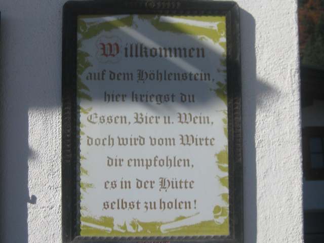 Bei unserer Wanderung vom Parkplatz Schneeberg/Hinterthiersee (970 m) zum Feuerköpfl machten wir Mittagspause im Almgasthof Höhlensteinhaus. Der gemütliche Anstieg vom Parkplatz zum Höhlensteinhaus nimmt geschätzte 1 ½ Stunden in Anspruch. Das Almgasthaus Höhlensteinhaus (1233 m) ist ein privater Alm Gasthof und ist laut Internet ab Pfingsten durchgehend täglich bis Ende Oktober bewirtschaftet. Das Höhlensteinhaus liegt am Fuße des Feuerköpfls der in etwa 10 Minuten zu erreichen ist. Da wir traumhaftes Herbstwetter hatten, haben wir uns es auf der sonnigen Terrasse des Almgasthauses gemütlich gemacht. Nett fanden wir eine Hinweistafel an der Hauswand mit dem Text „ Willkommen auf dem Höhlenstein, hier kriegst du Essen, Bier und Wein doch wird vom Wirte dir empfohlen, es in der Hütte selbst zu holen“. Die Speisekarte war auf einer Kreidetafel am Eingang des Alpengasthofes und an der Theke vermerkt. So gab es u.a. Speckknödel mit Suppe oder Sauerkraut 3,50/4,00 Euro, Pressknödel mit Suppe oder Sauerkraut 5,00/5,50 Euro, Nudelsuppe mit 5,00 Euro, Faschierte Laibchen mit Reis, Kartoffel, Krautsalat 7,00 Euro, Speckbrot 3,50 Euro und Käsebrot 3,50 Euro. Wir haben uns für Pressknödel mit Suppe und Nudelsuppe mit Würstel entschieden. Aufgrund der guten Organisation gab es kaum Wartezeiten an der Theke. Die Beschäftigten des Hauses waren sehr freundlich. Als Nachspeise genehmigten wir uns noch einen hausgemachte Yoghurttorte 2,50 Euro. Der Almwirt hat auch mehrere Zwerghühner, besonders ein Zwerghahn erfreute sich bei den Gästen mit seinem lauten Kikeriki. Vom Wirtsgarten des Almgasthauses hatte man einen phantastischen Ausblick auf die umliegende Bergwelt. Neben dem Alpengasthof befindet sich auch eine kleine Kapelle. Es fiel uns sehr schwer, bei diesem phantastischen Wetter die Almwirtschaft zu verlassen. Trotz des begrenzten Speiseangebotes ein empfehlenswertes Almgasthaus.