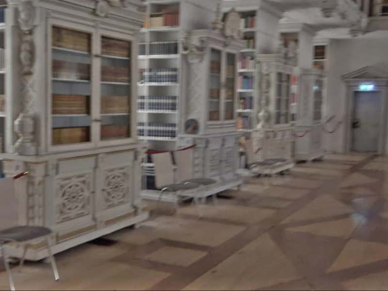 Der große Saal der Bibliothek wurde 1786 bis 1796 in der Prälatur errichtet. Die Ausstattung entstand im klassizistischen Stil. Der Boden ist ein dunkles, grobes Rautenmuster, welches im Parkett ausgelegt ist. Die Bibliothek wurde beim große Brand verschont, sodass der Bestand, aus dem Mittelalter, fast vollständig erhalten ist. 1826 wurde der Bestand teilweise verkauft. In der Bibliothek befinden sich die Porträts der wichtigsten Äbte.