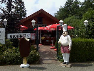 Einer der Gründe die niederrheinische Kleinstadt Rees zu besuchen ist ein bekannter Garten- und Landschaftsbauer, der dort ein riesiges Ausstellungsgelände hat. Nachdem wir dort mehrere Stunden durchgelaufen sind und ein bißchen müde waren, besuchten wir den dazugehörigen Bistro. Der ist uns jetzt einen Hinweis wert, weil man dort nett sitzen kann und wir aus der großen Auswahl jahreszeitlich bedingt einen erstklassigen Erdbeerpfannekuchen zu uns genommen haben. Jetzt gibt es schon zwei Gründe.....