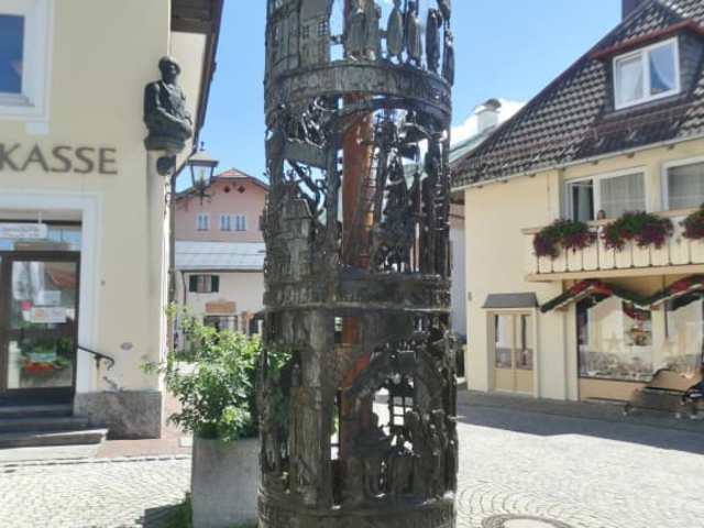 In der Dorfstraße / Ecke Schnitzlergasse (vor der Sparkasse und gegenüber vom Geburtshaus von Ludwig Thoma) befindet sich ein schöner Bronzebrunnen, der auf diversen „Stockwerken“ in mehreren Szenen die Geschichte von Oberammergau erzählt. So sind der Krieg, die Pest, die Passionsspiele, König Ludwig von Bayern, die Lüftlmalerei usw. dargestellt. Es ist durchaus interessant, wenn man sich diesen Bronzebrunnen näher anschaut. Mir hat dieser Brunnen zumindest gut gefallen.