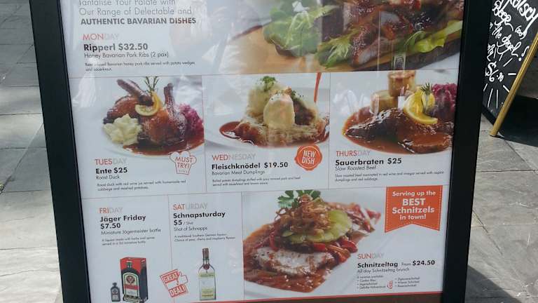 Direkt am Raffles Place gegenüber dem Raffles Hotel findet man ein typisch deutsches—bayrisches Lokal. Hier kann man gut und günstig essen. Vorallen ,wenn man nicht mehr Lust auf asiatisches Essen hat.Im Grunde kann man die Palette der bayrischen Küche bestellen und natürlich jede Menge Schnitzelvarianten. Portionen sind gut und groß.Preise würde ich sagen, deutsche Verhältnisse. Deutsches Bier gibt es hier auch. Innen und Außenbereich—aber eher klein und eng. Von der Einrichtung her, nichts Besonderes. Wir haben hier gut gegessen.