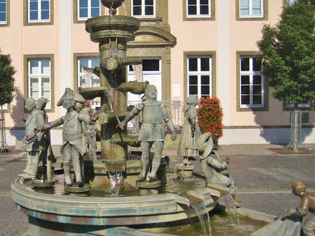 Der Bürgerbrunnen ist einfach toll. Dort sind Menschen unterschiedlicher sozialer Klassen dargestellt, die alle irgendeinen Bezug zur Geschichte der Stadt haben. Da gibt es eine Bäuerin, einen Handwerker / Gerber und einen Kaufmann. Der Mann mit der Gitarre ist Simplizius Simplizissimus, der Krieger mit Rüstung und Schwert Bernhard II. zur Lippe, Gründer von Lippstadt im Jahr 1185. Ein eher kleiner Mann daneben ist Friedrich der Große, König von Preußen. Weiterhin sind zu sehen der Bürgermeister, Dr. Johannes Westermann (ein Schüler von Martin Luther) und Amalie Elisabeth von Hessen-Kassel (regierende Landgräfin im 30jährigen Krieg). Entworfen wurde der Brunnen vom Künstler Bonifatius Stirnberg lt. Quellen 1985 zum 800 jährigen Jubiläum der Stadt. 1988 wurde er dann vor dem Stadtpalais / dem Standesamt eingeweiht. Die Bronzefiguren sollen beweglich sein. Sie sollen an den Gelenken bewegt werden können. Ich habe es aber nicht ausprobiert. :-) Quellen: wikimapia.org total-lokal.de lippstadt.de