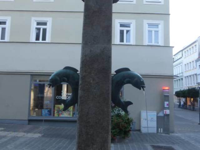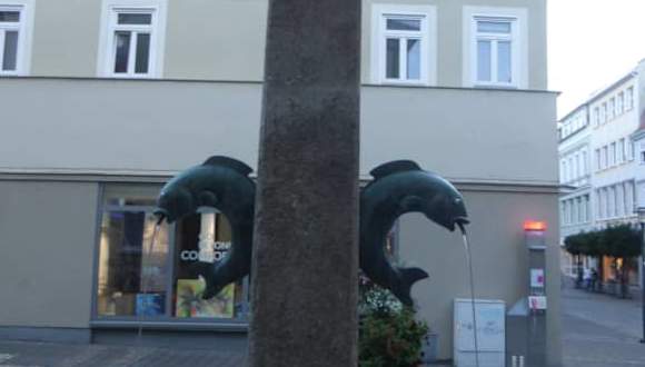 Zwei Fische aus Bronze dienen als Wasserspender