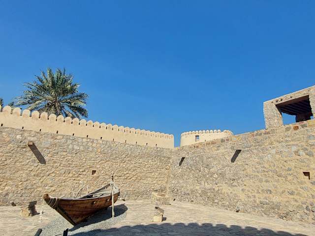 Das Khasab Castle ist eine Museumsfestung, welche etwas außerhalb des Zentrum von Khasab zwischen Port und Dhau Hafen liegt. Erbaut wurde die Festung, die ursprünglich direkt am Meer stand, von den Portugiesen. Das Fort ist nicht wirklich groß, aber es gibt viel zu sehen. In den einzelnen Räumen bekommt man einen Einblick in die traditionelle Lebensweise der Omanis. Ungewöhnlich ist der Rundturm in der Mitte des Fort. Hier kann man neben der Ausstellung und den Vitrinen auch eine Video sehen. Ebenfalls zu sehen ist ein halb unterirdisches Haus wie es in den Bergregionen gebaut wurde. Von den vier Bastionen aus hat man einen tollen Blick auf das Meer und beide Häfen. Der Eintritt in die Festung kostet 3 OMR. Zahlen kann man allerdings nur mit Kreditkarte und nicht mit Bargeld. Wenn man die Möglichkeit hat, sollte man einen Besuch so einplanen wenn gerade kein Kreuzfahrtschiff im Hafen liegt, den dann wird es richtig voll. So hat man das Fort praktisch für sich allein. Freitags hat die Festung ab 11 Uhr geschlossen. Etwa 1 km entfernt befindet sich noch ein zweites Castle mit dem Namen Al Kamazerah Castle. Ein ausgewiesener Fußweg, der direkt links am Khasab Castle beginnt, verbindet beide Festungen.