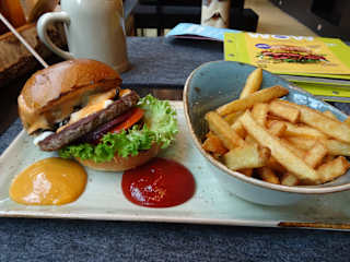 Durch die etwas abgelegenere Lage war es wie immer angenehm ruhig in der Tübinger Straße. Die Sitzmöglichkeiten im Außenbereich schienen teilweise neu - wirkten aber etwas unbequem, daher ging es in den Innenbereich. Die Polster dort wirkten teilweise schon etwas abgenutzt und auch die Kunstblumendeko war nicht mehr ganz so ansprechend. Mit dem Essen dauerte es etwas - allerdings war das Burgerpatty und die Pommes nicht mehr heiß sondern eher nur noch lauwarm, stand also wohl schon ein Weilchen. Ansonsten hat es gepasst.
