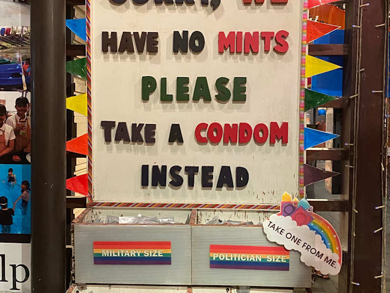 Das Restaurant befindet sich in Sukhumvit, in einer Seitenstraße Soi 12. U-Bahn-Station ist Sukhumvit. Mich hat der Name im Reiseführer neugierig gemacht, man sollte sich davon nicht abschrecken lassen, der Name wurde von einer Anti-Aids-Organisation vergeben. Die Speisekarte bietet eine reichhaltige Auswahl an thailändischen Gerichten. Die Preise sind natürlich höher als in den Garküchen, aber immer noch billiger als in den Hotels.