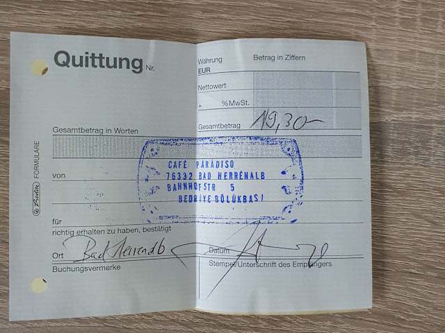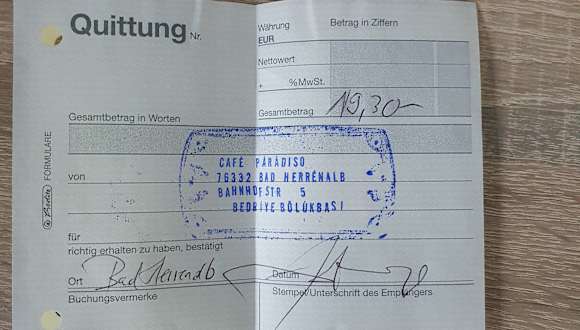 Besuch am Montag, 1. Juli 2024 nachmittags zu Kaffee & Kuchen Das Café Paradiso, liegt unweit des Bahnhofes von Bad Herrenalb entfernt. Es handelt sich um ein Café mit Kaffee, Kuchen, Eis & kleinen waren Speisen. Von der Straße aus, gibt es Aufsteller , welche man Eisbecher sieht und den für die waren Speisen. Im Innern an der Theke sind Kuchen & Tortenpreise angebracht, allerdings nur 'Mitnahme' - hier sollten auch entsprechend die Preise zum Verzehr vor Ort angegeben sein. Bestellung: > Käsekuchen 4,10 € > Tasse Schokolade 4,90 € > Kartoffel-Rösti mit Kräuter-Quark für 5,90 € > Klostergarten Birne-Ingwer 0,33l-Flasche für 4,40 € Zusammenfassung: Der Käsekuchen hatte eine blasse Struktur und beim servieren, ist ein kleines Stück abgebrochen, die Schokolade war im Geschmack schwach, der Kartoffel-Rösti mit dem Kräuter-Quark war TK und der Quark hatte obendrüber ein Gewürz, welches dem des Tzatziki-Gewürz sehr ähnlich sah und auch so schmeckte und dem Gericht so eine persönliche Note geben sollte. Leider hat die Kombination inkl. dem Gewürz so gar nicht zusammengepasst und aus meiner Sicht, sollte sich das Café lieber auf Eis, Kuchen & Kaffee konzentrieren, das Personal war bemüht, die Aufgaben gut zu bewältigen; die Seiten der Eiskarte sind sehr vergriffen und gehören von Zeit zu Zeit einmal erneuert (sieht unschön aus!). Während meines Besuches ist die Mitarbeiterin zwei Mal vor den Laden gegangen, hat sich an einen der freien Tische mit einem Tee gesetzt, hat eine Zigarette geraucht und dabei mit ihrem Handy herumgemacht. Dies macht grundsätzlich keinen guten Eindruck, auf ein Geschäft, wenn man das Personal so sieht. Im Laufe des Besuches habe ich auch die Toilette besucht, die im hinteren Bereich ist - etwas renovierungsbedürftig und einfach gehalten. Zum Abschluss beim Bezahlen habe ich dann nach einer Rechnung gefragt und habe durch das Personal eine 'Quittung mit Stempel' aus einem Quittungsblock handschriftlich gefertigt bekommen - sehr ungewöhnlich, daher in der Gesamtbewertung 1 Note Abzug. Ich würde das Café Paradiso nicht weiterempfehlen, da mich das Gesamte nicht überzeugt hat und es mit Sicherheit in Bad Herrenalb bessere Cafés gibt.