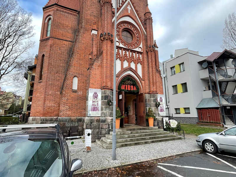 Das Café-Wieza (Café Turm) befindet sich im Turm der 1945 bei einem Bombenangriff zerstörten Lutherkirche. Außer dem Turm blieb so gut wie nichts von der Kirche übrig (durch den Angriff am 12.03.1945 durch die US-Luftflotte wurde Świnoujście / Swinemünde nahezu vollständig zerstört). Man kann den Turm besteigen (Eintritt 10 PLN im Mai 2017), von oben hat man einen schönen Blick über Świnoujście / Swinemünde, aber auch über die Grenzen der Stadt hinaus. In dem Turm ist heute ein nettes, gemütliches Café beheimatet, das Café-Wieza (Café-Turm). Nachdem man die Aussicht genossen hat, kann man beim Abstieg im 1. Stock im Café-Wieza eine Pause einlegen. Wir hatten hier einen recht guten Kaffee und Kuchen, aber auch andere Getränke und Essen sind erhältlich. Die Bedienungen waren etwas unbeholfen, aber recht freundlich. Die Preise waren durchaus o.k. Wer natürlich nicht den Turm besteigen will, sonder nur etwas Trinken / Essen will, kann natürlich in das Café-Wieza kommen.
