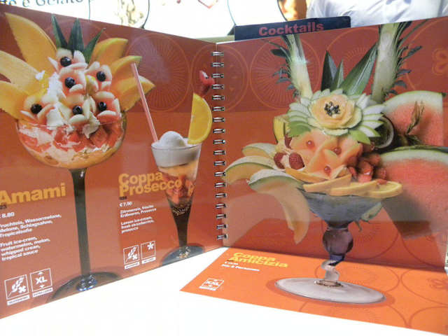 Nach einem ausgiebigen Bummel durch das Arkaden Center am Potsdamer Platz in Berlin-Tiergarten war uns bei sommerlichen Temperaturen nach einem Eisbecher zu Mute. In der ersten Etage des Berliner Einkaufszentrums fanden wir in der Eisdiele Caffè e Gelato eine Vielfalt an italienischen Eissorten die uns sofort ansprachen. Da auch das Auge mitisst und uns die Lokalität gefiel suchten wir uns in der gut besuchten Lokalität ein Plätzchen. Die Gelatieri unterscheiden bei ihrem Angebot unter vier Geschmacksrichtungen. Erstens Classic, es sind die „Klassiker“ wie die Sorten Stracciatella oder Joghurt, Vanille, Schokolade, Zitrone. Bei der Premium Sorte handelt es sich um Exoten wie Biscottino (Mascarponeeis mit Keksen und Nougatsoße) oder Fruttissimo (Kiwi-, Bananen- und Ananaseis mit Passionsfrucht-Mango-Soße). Für Gesundheitsbewusste Kunden wird Eis ohne Zucker und ohne Lactose angeboten. Bei dem vierten Angebot handelt es sich um „biologisches Eis“. Ob Pistazie, Vanille, Bacio Bianco oder andere: alle Sorten dieser Richtung sind mit dem Bio-Siegel gekennzeichnet. Wir entschieden uns für einen köstlichen Eisbecher „Coppa Prosecco“, eine Köstlichkeit aus Zitroneneis, frischen Erdbeeren und natürlich Prosecco, der in seiner Aufmachung mit den Früchten auch für das Auge eine Besonderheit und im Juli 2012 eine Erfrischung war.