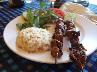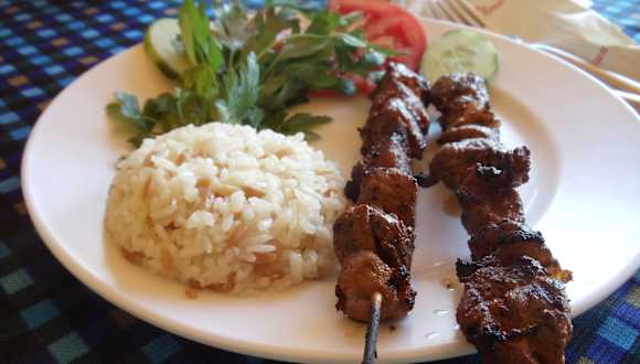 Wir besuchten Ende September den Wasserfall in Manavgat. Wir haben nicht in diesem touristischen Restaurant gegessen. Wir sind weitergefahren, ca. 6 km Richtung Nationalpark/Stausee. Hier kommen Sie vorbei am "Restaurant am Wasserfall - Caglayan Restaurant". Es empfängt Sie Sinan und Sie können auf der Terrasse entspannen und lecker essen in diesem herrlichen Restaurant direkt am Manavgat. Wir haben uns entschieden für Lammkotelett (11 EUR), und Lammspieße (8 EUR). Es war ein Erlebnis, alles frisch zubereitet. Zur Vorspeise gab es etwas Brot mit Knoblauchdip.