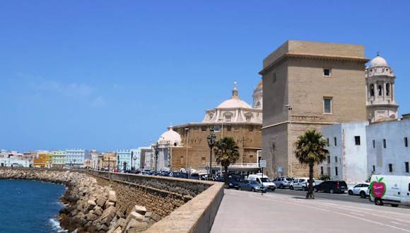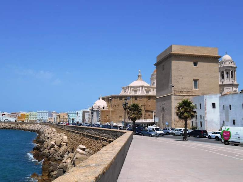 Von der Promenade hat man den Blick entlang der Küste zum Castillo de San Sebastián und zum Strand Playa de Caleta. Von dieser Seite kann man auch die goldene (?) Kuppel der Kathedrale besser sehen als vom Platz vor der Kathedrale. An der Rückseite der Kathedrale befindet sich auch das alte römische Amphitheater, das in Teilen erhalten ist.