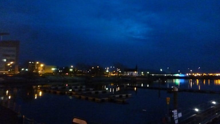 Schöne Architektur, Einkaufszentrum, norwegische Kirche, eine Bucht mit Freizeitsbooten und vielen Restaurants und Geschäften