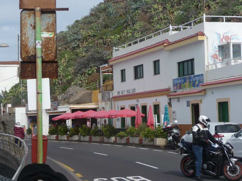 Die kleine Ansiedlung Roque de las Bodegas liegt direkt am Meer, östlich von Taganana. Sie ist nur über die Straße, die kurz nach El Bailadero von der Kamm-Straße des Anaga-Gebirges abzweigt, zu erreichen. Wir waren in dem einfachen Lokal "Casa Pepe" und saßen auf der überdachten Terasse. Es gibt keine Speisekarte, man kann wählen Fisch ohne oder mit Salat-Teller. Der bunte Salat-Teller ist sehr zu empfehlen. Zu dem Fischgericht, es dürfte der "Vieja" sein, gibt es papas arrugadas mit mojo. Der Fisch ist eine Riesenportion, schmeckt ausgezeichnet und ist wegen der harten Gräten gut zu filetieren. Zu dem Menü gehört auch Rotwein, Brot und Käse. Da das Lokal gut besetzt war dauerte es einige Zeit bis das Essen kam, aber das Warten lohnte sich. Wegen des üppigen Essen, die Hauskatze wurde auch satt, benötigten wir zum Schluß noch einen doppelten Espresso.