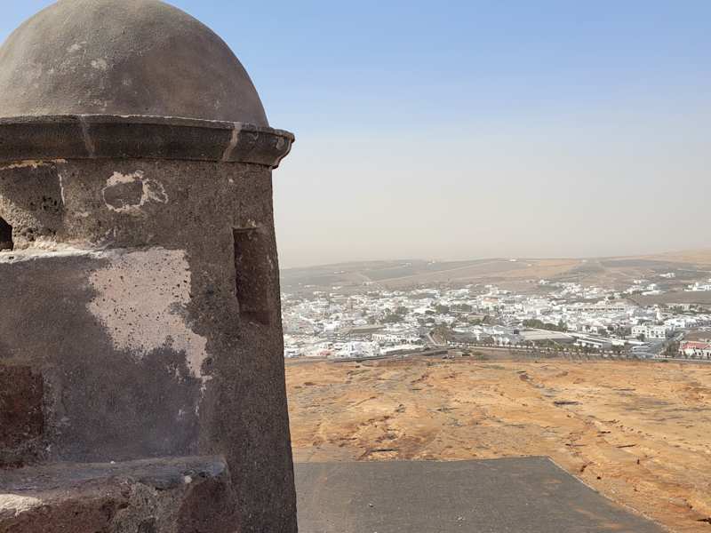 Über der kleinen Stadt Teguise tront auf einem Vulkan die Burg Santa Barbara. Eine kleine Strasse windet sich hinauf, man kann sie bequem mit dem Auto erreichen. Über eine Zugbrücke gelangt man in den kleinen Innenhof. Für EUR 3,00 kann man die Innenräume der Burg besichtigen, in der sich eine Ausstellung zur Spanischen Emigration befindet. Bilder, Bücher und Modellschiffe sind zu sehen. Witzig ist eine nachgebaute Szene mit Figuren aus Knetmasse. Da haben sich einige viel Mühe gegeben. Es gibt im Inneren eine Brunnen, der viele Münzen enthält. Aus dem Reiseführer entnahmen wir, dass die hineingeworfenen Münzen keinerlei Bedeutung haben. Ein Besucher hat mal damit angefangen und seither werden es immer mehr. Auf dem Dach der Burg hat man einen weiten Ausblick über das umliegende Land. Falls man nur nach oben will, ist dies kostenlos.