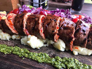 Das wunderbar in der Natur gelegene Restaurant befindet sich mitten im Tsitsikamma Nationalpark 6308 Storms River, Eastern Cape, Südafrika. Uns hat ein höflicher Service empfangen nachdem wir uns nach draußen an Holztischen mit Bänken gesetzt hatten. Von dort aus konnte man die Meeresbrandung an den Felsen beobachten. Es gab Schatten durch Sonnensegel. Wie schon so oft auf unserer Südafrika Rundreise wurden wir, mit unserer Meinung nach hervorragend gutem Steakfleisch verwöhnt. Die können das dort einfach. Wir probierten auch eine gefüllte Steakfleischrolle ,sehr würzig, mit Salat Garnitur serviert auf einem Holzbrett . Das alles mit Aussicht auf den indischen Ozean und einigen frischen Draught beer.