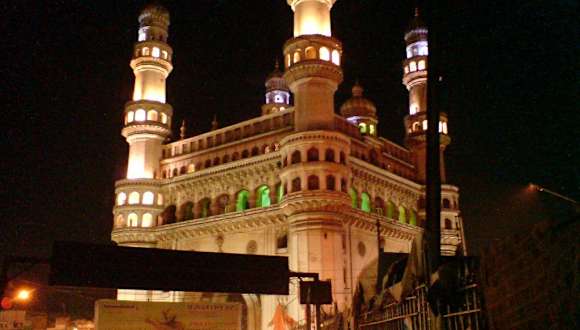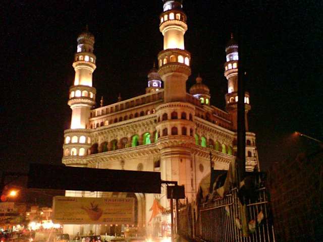 Der Charminar ist ein Denkmal, 56 Meter hoch mit vier Minaretten und ist das Zentrum der Altstadt, südlich gelegen vom Fluss Musi. Der Charminar wurde vom Stadtgründer, dem König Quli Qutb Shah 1591 zur Erinnerung an das Ende der Pest gebaut.