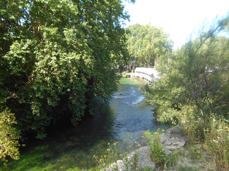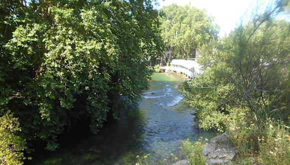 Der Chemin de la Fontaine beginnt am Kreisverkehr mit der Gedenksäule für den Dichter Francesco Petrarca („Colonne Pétrarque“) und führt dann am Ufer der Sorgue vorbei an der alten Papiermühle bis zur Quelle. Es ist ein Spaziergang von etwa 15 Minuten durch das malerische Dorf Fontaine-de-Vaucluse, der keine sportlichen Anforderungen stellt.