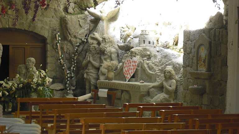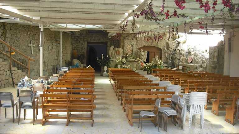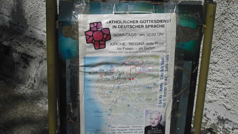 Durch einen Aushang im Hotel wurden wir aufmerksam: in der “Chiesina Regina delle Rose” findet jeden Sonntag ein katholischer Gottesdienst in deutscher Sprache statt, das Ganze sogar im Freien bzw. im Garten. Wir sind jetzt nicht sooo die Kirchgänger, aber ein Zusatz auf dem Plakat machte uns dann doch stutzig: der Pfarrer Don Pasquale Sferratore singt … Das allein hätte uns jetzt nicht gelockt, aber Ohrwürmer wie “O sole mio”, “Santa Lucia”, “Mamma“, “O mia bella Napoli” usw. ? Nun ja, es war dann Pfingst-Sonntag, man hat Urlaub und nichts Besonderes vor … Also machten wir uns auf zur Chiesina, einer Art Kapelle. Den Weg dorthin hatten wir unter der Woche bereits erkundet. Dabei waren wir dem Pfarrer schon über den Weg gelaufen und wurden per Handschlag sehr herzlich begrüßt und herumgeführt. Ein Grund mehr, sich dafür am Sonntag mit dem Kirchgang zu revanchieren. Der Gottesdienst lief dann ganz “normal” ab in gut verständlichem Deutsch, wobei die herzerfrischende Art des Pfarres auch Lacher produzierte. Nach dem Segen, wenn sonst alle erleichtert abziehen, setzten sich die Besucher wieder (waren wohl viele Wiederholer dabei). Darauf kam das verschmitzte: “Sie wollen noch nicht gehen? Soll ich etwa noch singen??? “ Aber ja … Alle auf dem Plakat angegebenen Titel - jeweils eine Strophe - wurden dann in kräftiger, sonorer Stimme abgesungen. Den Beifall aber widmete er dem lieben Gott, dem er diese Gabe zu verdanken hätte. Der herumgereichte Klingelbeutel erinnerte dann wieder an die weltlichen Gaben und kam wohlgenährt zurück. Und wenn dann noch der Absatz der CD’s und Cassetten gut läuft, muss man sich um den Fortbestand der kleinen Kirche keine Sorgen machen. Für uns jedenfalls war ausgerechnet ein Kirchgang das Highlight des Sonntags - das hatten wir schon lange nicht mehr ...