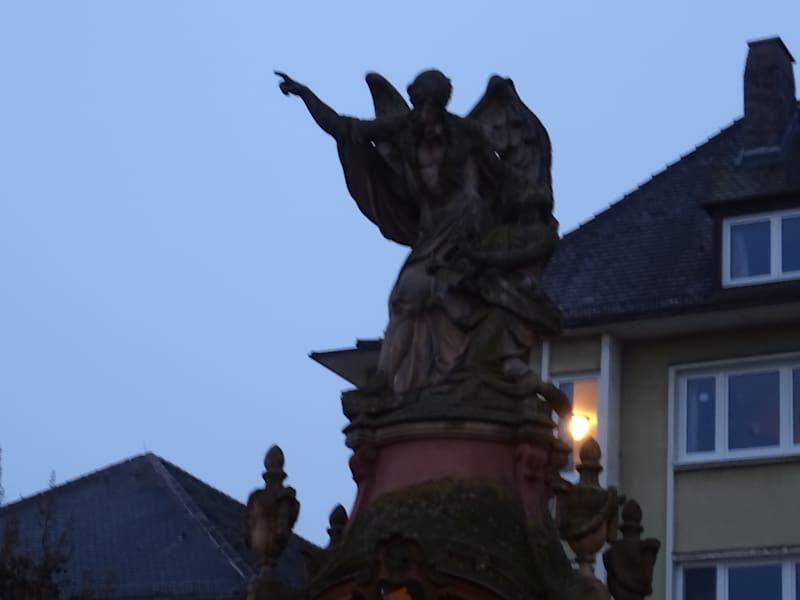 Der Chronosbrunnen (auch Moenusbrunnen genannt) ist zwar nicht der bekannteste Brunnen von Würzburg, aber durchaus interessant. Die dargestellten Figurengruppe ist zweigeteilt. Ganz oben steht der geflügelte Chronos, der griechische Gott der Zeit und zeigt mit der rechten Hand den Weg zur Residenz von Würzburg. Links von Chronos ist eine kniende Frauenfigur (welche Clio, die Muse der Geschichte dastellen könnte). Unterhalb von Chronos befindet sich eine angedeute Grotte, in der sich der Flußgott „Moenus“ befindet, welcher hier den Vater Main verkörpert. Unter dem Vater Main ist schließlich das kleine Brunnenbecken. Wir sind auf unserem Weg von der Residenz zum Dom durch die Hofstraße gekommen und haben dabei mehr oder weniger zufällig diesen Brunnen gesehen, der interessant ist und der uns recht gut gefallen hat. ANMERKUNG: Chronos ist der griechische Gott der Zeit, den man nicht verwechseln sollte mit Kronos, welcher der Vater von Zeus war.