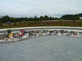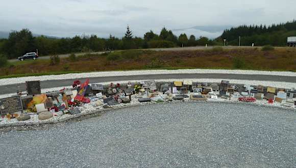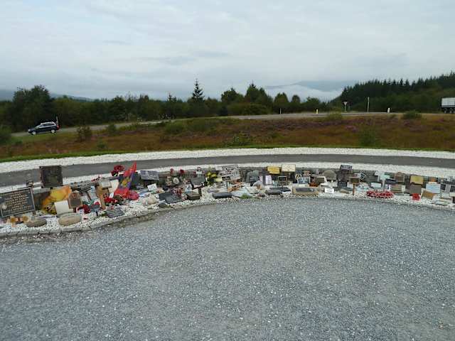1952 weihte Queen Elizabeth, die Mutter der heutigen Queen, das "Commando Memorial" ein. Dieses Kriegerdenkmal sollte an die gefallenen britischen Soldaten im 1. und 2. Weltkrieg erinnern. Die "Commandos" hatten ihren Übungsplatz in dem weiten Gelände zwischen dem Memorial-Hügel und dem Ben Nevis im Hintergrund gehabt. Heute erinnern viele kleine Gedenktafeln auf dem "Garten der Erinnerung" unterhalb des Denkmals an die Teilnehmer und natürlich auch die Toten weiterer Kriege, wie Irak oder Afghanistan. Man sagte uns, hier würden auch Urnen mit den sterblichen Überresten von Veteranen begraben oder ihre Asche im Umfeld verstreut werden. Am Fuße des Memorials liegen Kränze aus leuchtend roten Papier-Mohnblüten.. Am "Remembrance Day" (so ähnlich wie unser Volkstrauertag) am 2. Sonntag im November legt auch die Queen einen Mohnblumenkranz an einem Kriegerdenkmal nieder und viele Briten stecken sich Mohnblüten an. Der Brauch geht auf ein Gedicht im 1. Weltkrieg zurück "In Flanders fields the poppies blow between the crosses, row on row.. " Seitdem gelten die Mohnblüten als Sinnbild der Erinnerung an alle gefallenen Soldaten.