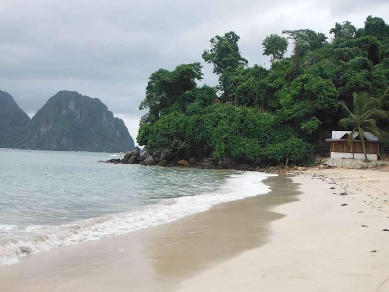 Die schöne Inselwelt des Bacuit Archipels ist sicher die Hauptattraktion von El Nido, man sollte sich aber auch nicht die tollen Strände am Festland entgehen lassen. Südlich von El Nido liegt die Corong Corong Bucht. Am gleichnamigen Strand findet man einige, recht günstige Resorts und ein paar Fischersiedlungen. Am flach abfallenden, eher dicht besiedelten, Corong Corong Beach kann man in das Alltagsleben Palawans eintauchen: Fischerhütten (man glaubt es kaum, teilweise auch mit Sat-TV), Basketballplätze, Hausschweine am Strand und sehr sehr nette und gastfreundliche Philippinos. Wirklich schön wird es dann weiter südlich. Bei der Abzweigung zum Las Cabanas Resort (mit dem Tricycle ab El Nido maximal 150 Pesos, ca. 2, 3 Euro) gibt es einen schmalen Fussweg zur Küste (ca. 5 Gehminuten). Der angrenzende Palmenstrand ist schlichtweg ein Hammer und beinahe menschenleer. Auch bei den beiden (nicht gerade günstigen, aber toll gelegenen) Resorts Las Cabanas und Dolaroc findet man schöne Strandabschnitte, die zwar nicht immer zum Baden geeignet sind, aber trotzdem tolle Ausblicke auf das Bacuit Archipel bieten. Die Sonnenuntergänge, die man hier erleben kann, sind superschön. Die schönsten Sonnenuntergänge, die wir jemals erlebt haben.