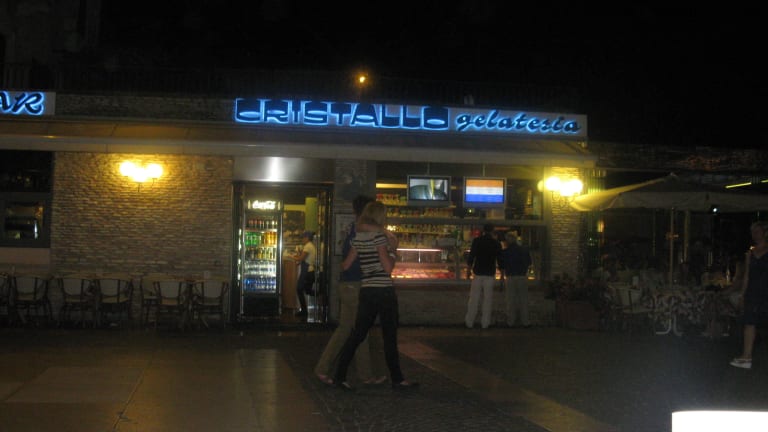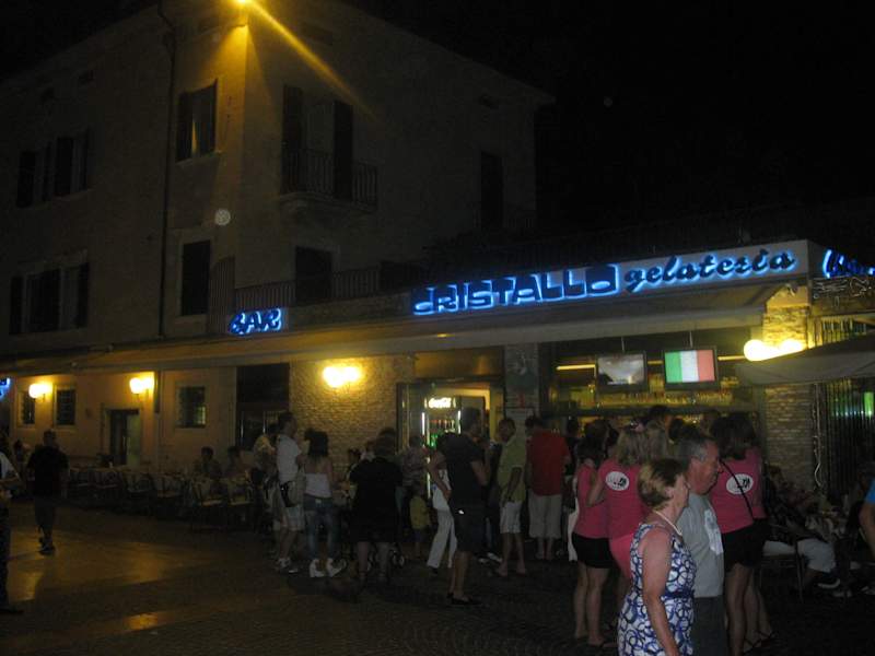 Bei schönem Wetter ist es im Cristallo immer sehr voll. Aber die Eisbecher lohnen das Warten! Wir schaffen zu zweit gerade einen Becher. Als Handeis genügt "una pallina". Am Gardasee haben wir in den 18 Jahren bereits sehr viele Gelaterias ausprobiert, aber nirgends war das Eis so köstlich!