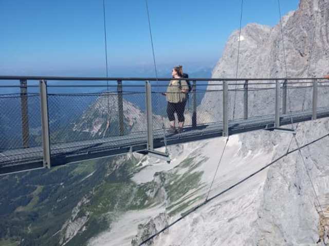 Wer will, der kann - wer nicht will, der muss nicht. Oben auf dem Dachsteingletscher hat man die Möglichkeit in wenig Nervenkitzel auszuleben. Österreichs höchstgelegene Hängebrücke lädt zu einem 100m langen Spaziergang auf der ca. 1 m breiten Hängebrücke bis zum gegenüberliegenden „Eispalast“ ein. Ein toller Ausblick ist garantiert. Das Geländer ist immerhin 1,3 m hoch und die gesamte 63 Tonnen schwere Stahlkonstruktion sieht zumindest sehr stabil aus. Soll sie doch auch Windstärken bis zu 250 km/h standhalten.