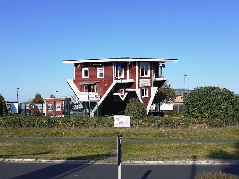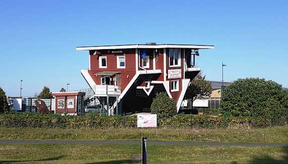 Das verrückte Haus ist schon von der Autobahn aus zu sehen. Der Snowdome und die Ralf SChuhmacher Kartbahn sind auch in unmittelbahrer nähe. Der Parkplatz ist für Besucher des Hauses kostenfrei (ansonsten 2€) Tickets bekommt man in dem Imbisshäuschen (5€). Das Haus ist nur was für Schwindelfreie Menschen gedacht, da es leicht geneigt ist. Ansonsten ist es schön gestaltet und sehr interessant.