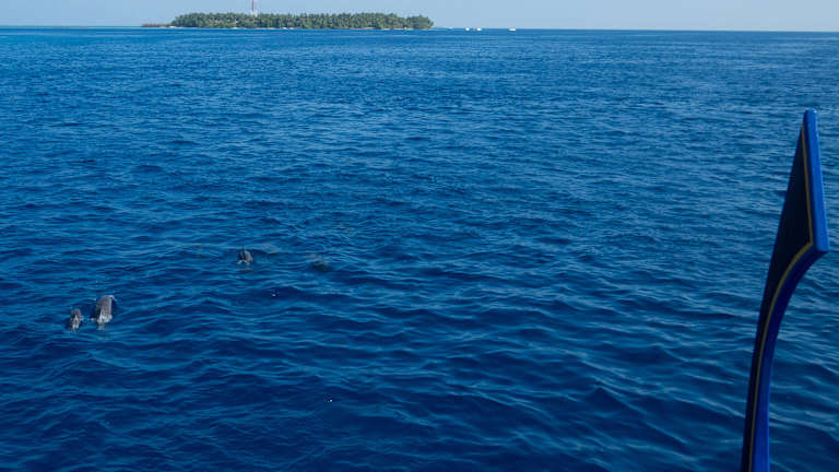 Alle Resorts auf den Malediven bieten Ausflüge an. Einer davon ist die Fahrt mit dem Dhoni, dem klassischen Einheimischenboot zum Beobachten von Delfinen. Mit etwas Glück kennen sich die Führer so gut aus, wo die Delfine wann sind, dass man nicht einmal sehr weit fahren muss.