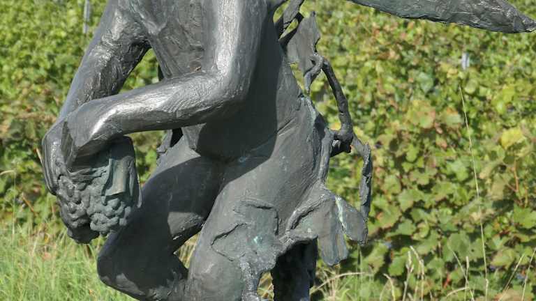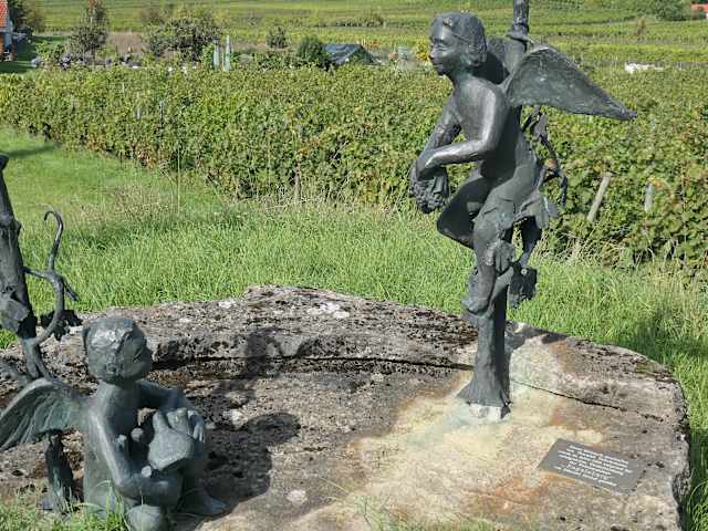 Das Denkmal „Engelsberg Sommerach“ ist eine schöne und verspielte künstlerische Umsetzung des Weinbaugebietes Engelsberg, das sich gleich nördlich / nordöstlich von Sommerach befindet. Dargestellt sind bei diesem Denkmal zwei kindliche Engel mit Trauben bzw. mit Bocksbeutel. Der Sommeracher Engelsberg, dem dieses nette Denkmal gewidmet ist, ist neben dem Sommeracher Katzenkopf und dem Sommeracher Rosenberg der Wein, der Sommerach weit über Franken hinaus bekannt gemacht hat.