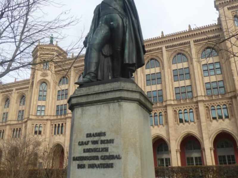 Das Denkmal Graf Bernhard Erasmus von Deroy befindet sich in der Maximilianstraße direkt vor dem Gebäude von der Regierung von Oberbayern. Das Standbild für den Gerneral Graf Deroy ist eines von vier gleichartigen Denkmäler in der Maximilianstraße zwischen Regierung und den ehemaligen Bayerischen Nationalmuseum. Die Maximilianstraße ist eine der vier städtebaulich bedeutenden Prachtstraßen Münchens aus dem 19. Jahrhundert, neben der Brienner Straße, der Ludwigstraße und der Prinzregentenstraße.. Graf Bernhard Erasmus von Deroy (1743 – 1812) war ein General der königlichen bayrischen Armee (Infanterie). Er kämpfte und führte Truppen in unterschiedlichen Allianzen gegen Frankreich, Österreich, Preußen und Russland. Er wurde vielfach ausgezeichnet. Kurz vor dem Tod wurde er noch von Napoleon zum Grafen ernannt. Graf Bernhard Erasmus von Deroy bekam u.a. das Großkreuz des Max-Joseph-Ordens und der Ehrenlegion. Der Militär Max-Joseph Orden war der höchste militärische Verdienstorden des Königreichs Bayern. Graf Bernhard Erasmus von Deroy war neben Wrede der bekannteste bayerische General der napoleonischen Kriege. Das Standbild wurde 1856 durch freiwillige Spenden der aktiven und pensionierten Offiziere finanziert und von Johann von Halbig (1814 – 1882) modelliert. Auf der Vorderseite des Denkmals kann man folgendes lesen. Erasmus Graf von Deroy Königlich Bayerischer General der Infanterie. Der General steht er mit offenem Mantel und gezogenen Säbel in der Rechten auf dem Denkmal.. Die Linke der übermannshohen Bronzestatue weist nach vorne.