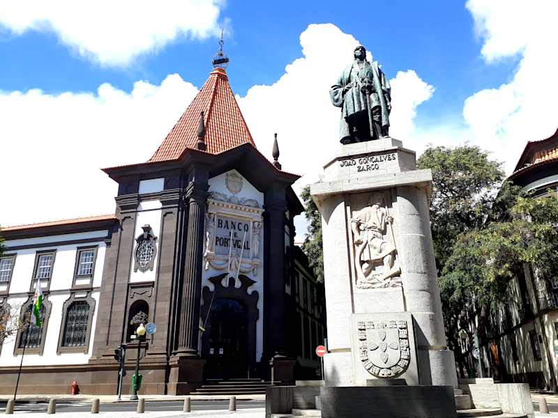 Seit 1940 steht vor dem Portal der „Banco de Portugal“ nahe der Avenida Arriaga auf einem Granitsockel die beeindruckende Bronze-Statue des Entdeckers von Madeira: Es handelt sich um den portugiesischen Kapitän João Gonçalves Zarco. Im Auftrag Heinrich des Seefahrers war er zunächst 1418 mit seinem Schiff bei Sturm auf Porto Santo gelandet um ein Jahr später, zusammen mit zwei weiteren Kapitänen, auch Madeira anzusteuern. In der Tat gilt Zarco allerdings nicht wirklich als der Entdecker des Archipels, denn dieses war schon in älteren Seekarten eingezeichnet, aber zur Zeit seiner Landung präsentierten sich sowohl Madeira als auch Porto Santo unbewohnt und gingen daher ohne Kampfhandlungen in den Besitz der portugiesischen Krone über. João Gonçalves Zarco, dem von „Heinrich dem Seefahrer“ der Südteil Madeiras samt Funchal als eine Art Lehen übertragen worden war, starb um 1467 auf der Insel.