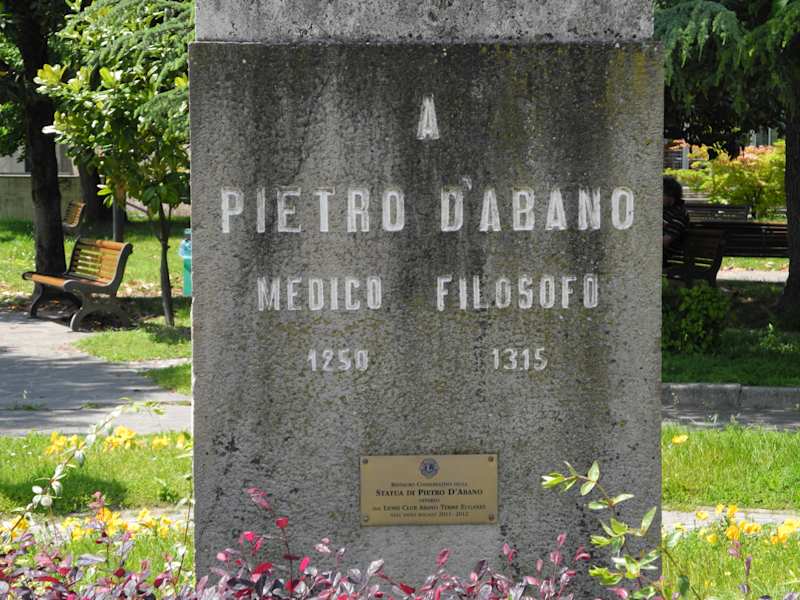 Man nannte diesen norditalienischen Mediziner auch Petrus von Abano. Er war ein Mediziner des Mittelalters, von diesen Personen gab es damals im 14. Jh. 21 Personen. Sein Denkmal steht am Wasserrondel, welches mit der Straße :Via Pietro d´Abano bezeichnet ist. Er war Arzt, Philosoph, Mathematiker und Astrologe in der Zeit von 1270 bis 1316. Geboren wurde er in Abano Terme, er starb in Rom. Wo er beerdigt wurde ist nicht bestimmt, man glaubt in Padua. Nach seinen Studien in Konstantinopel und Paris wurde er als Medicus an die Universität Padua geholt.