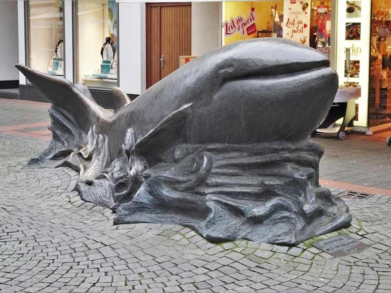 Der Nordbremer Stadtteil Vegesack bildete vor Jahrhunderten einen wichtigen Hafen der Hansestadt, denn die zunehmend verschlammte Weser erlaubte vor ihrer Korrektion größeren Schiffen keine weitere Passage stromaufwärts. So hatten in Vegesack nicht nur die Logger der Heringsflotte ihren Liegeplatz, sondern auch die Walfänger, die in der Arktis auf Beutezug gingen – immerhin war der Tran der Wale vor der Ära des Petroleums der wichtigste Brennstoff für Lampen und Laternen. An die Zeit des Walfanges, die gegen 1870 ihr Ende fand, erinnern in Vegesack noch die mächtigen Walkiefer am Utkiek, die Wal-Fluke an der Weser-Promenade und als Highlight das Denkmal „Wal in Vegesack“ in der Gerhard-Rohlfs-Straße. Bildhauer Uwe Häßler schuf das Bronze-Kunstwerk im Auftrag der Bremer Sparkasse und die Enthüllung fand 1978 statt. Seither ist der Wal nicht nur ein begehrtes Foto-Objekt in der Fußgängerzone, sondern steht auch bei Kindern hoch im Kurs, die gern auf seinem Rücken reiten. Vielleicht noch nett zu wissen: Seit der verbesserten Wasserqualität der Weser werden immer wieder auch kleine Schweinswale im Fluss gesichtet und selbst Seehunde besuchen gelegentlich die Stadtmusikanten.