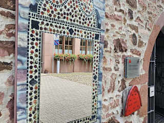 02.08.24 Sprechender Spiegel / Lohr am Main TIPP: Schneewittchens Schloss im Hintergrund Am Schlossplatz an der Außenwand des Fachwerkgebäudes der Touristeninformation ist eine Nachbildung des berühmten „Sprechenden Spiegels“ angebracht. Das Original hängt nebenan im Spessartmuseum im Schloss und entstand in der Kurmainzischen Spiegelmanufaktur in Lohr im 18. Jh. Stellt man sich vor den Spiegel und macht ein Foto ist Schneewittchens Märchenschloss im Hintergrund zu sehen.