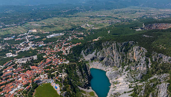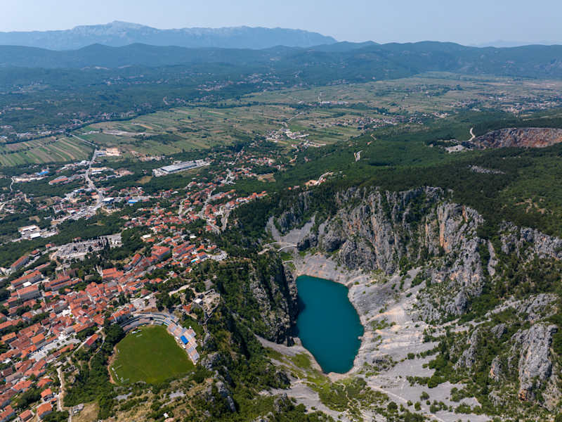 Die schönsten und interessantesten Karstformationen in den Bergen sind die des blauen Sees (Modro Jezero). Der See ist durch seine unterirdischen Kanäle des Adriatischen Meeres verbunden. Dieses Schiff ist der sogenannte Karst-Trichter, das bedeutet, dass er durch den allmählichen Abbau eines Substrats (in der Regel Kalkstein) der unterirdischen Kasematten und das fließende Wasser geformt worden. Der blaue See hat eine maximale Tiefe von etwa 220 Fuß. Die Wassertiefe ist jedoch abhängig von der Jahreszeit und der Menge der Niederschläge. Der See hat eine Fläche von 800 x 500 Meter. Im Sommer hat er nur eine 100 Meter Tiefe oder ist vollständig ausgetrocknet. Wenn der See ausgetrocknet ist, kann man sich auf der Oberfläche des Sees bewegen. Der See gehört zu einem beliebten Ort zum Schwimmen. Die Straße führt zu den Denkmälern des blauen Sees, welche verschönert wurden als die Nachricht angekommen ist, dass Kaiser Franz Josef I im Jahr 1907 diese Region besuchen wird. An diesem See befindet sich die alte Festung von Imotski, die bereits im 10. Jahrhundert in den Geschichtsbüchern erwähnt wurde. Genau um diese Festung herum baute man die Stadt Imotski an.