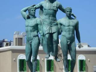 Diagoras von Rhodos, 464 v. Chr. Olympiasieger im Faustkampf) galt als Ausnahmeathlet, weil er nicht nur die Olympischen Spiele sondern alle vier panhellenischen Spiele eines Umlaufs gewonnen hatte. Vier Jahre später wurden auch zwei seiner Söhne Olympiasieger. Das Denkmal in Rhodos zeigt, wie die Söhne nach ihrem Sieg den Vater kurz vor seinem Tod durch das Olympia-Stadtion tragen.