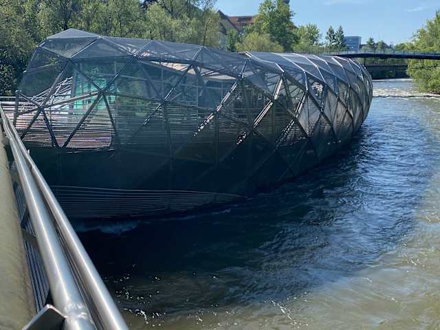 Die Murinsel ist eigentlich ein Veranstaltungszentrum auf der Murg. Sehr futuristisches Aussehen macht die Insel zu einem Fotomotiv erster Kategorie. Sie wurde für das JAhr 2003 entworfen und man wollte Sie später eigentlich entsorgen, aber mittlerweile bleibt sie weitere 10 Jahre. MAn kann dort KAffee trinken. Die Insel ist mit beiden Ufern der Mur verbunden.