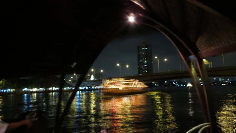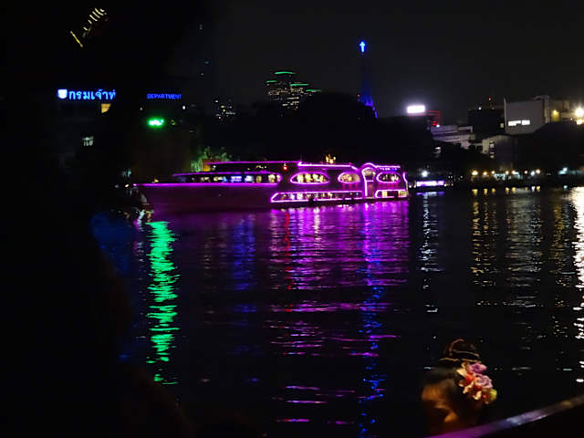 Ein schöner Tagesabschluß ist die Fahrt mit einer alten Barge auf dem Chao Phraya. Diese Tour dauert ca. 1,5 Stunden und startet jeweils 18:00 und 20:00 Uhr vom Pier des Oriental Hotel in nördliche Richtung. Nach der Rama VIII Bridge wendet das Schiff und es geht zurück. Links und rechts des Ufers passiert man die unterschiedlichsten Gebäude, wie den Königspalast, den Wat Arun usw., welche am Abend beleuchtet werden. Während der Fahrt wird ein Mehrgängemenü ( Meeresfrüchte oder Thai )gereicht und von kurzen Tanzeinlagen und Erläuterungen des Inhabers begleitet. Das Essen war gut, nur leider das Tempo etwas zu hoch. Aber im Großen und Ganzen ein empfehlenswerter Ausflug mit angenehmen Ambiente. Wir haben 38,-Euro für das Menü bezahlt. Die Getränke snd extra.