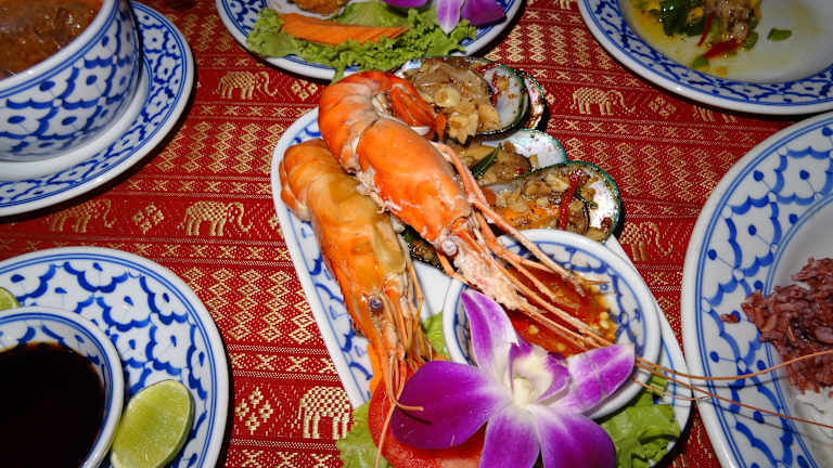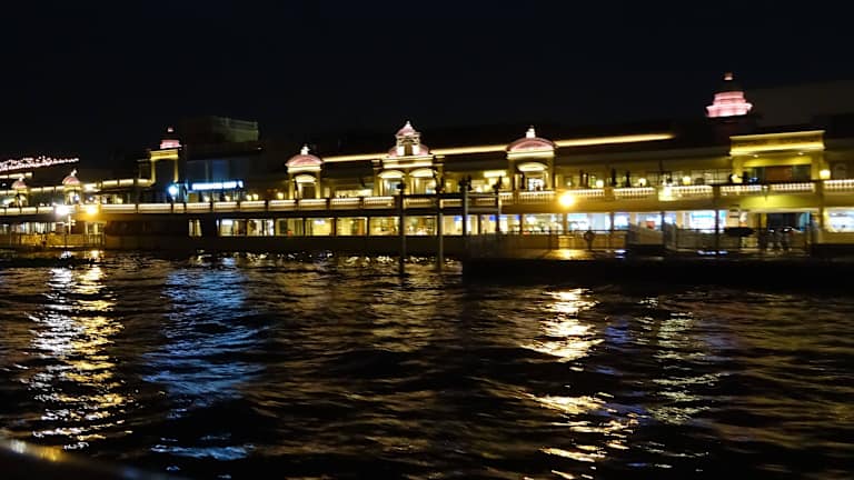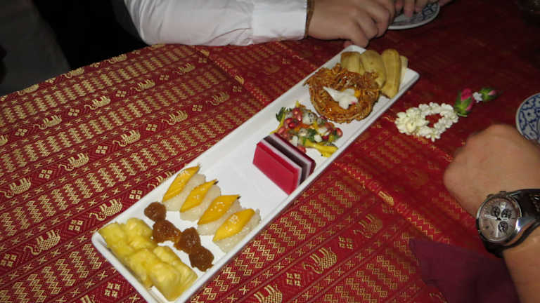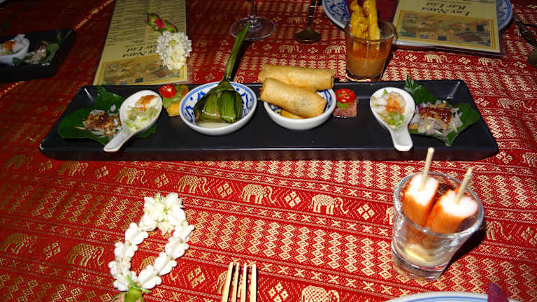 Auch wir dachten uns, es wäre ganz nett, wenn wir unseren letzten Abend mit einem Dinnercruise verbringen und haben uns dafür die Loy Nava ausgesucht. Wir 4 waren total zufrieden mit der abendlichen Fahrt auf dem Chao Praya. Man sieht auf den ersten Blick ein paar der historischen Tempel und Palästen, kann dabei noch ein 5- Gänge- Menü zu sich nehmen und den Anblick des Lichtermeers und der gewaltigen Hochhäuser mit den vielerlei glanzvollen, beleuchteten Fassaden genießen. Hier einige Dinge, die wir auf den Tellern/ Schüsseln hatten: Suppen: entweder Suppe mit thailändischem Gemüse (ähnlich einer Julienne) oder mild- scharfe Shrimpsuppe in Kokosnuss. Vorspeisen: gegrilltes Schweinefleisch/ Chicken Satay in einem Schnapsglas mit Erdnuss-Sauce / mariniertes Huhn mit thailändischer Pflaumensauce / Pomelo und Garnelen mit frischer, junger Kokosnuss in einem Betelblatt serviert / angebratener Thunfisch in Pepperoni- Mus / mariniertes Wachtelei in einer Sauce aus Limetten, Zucker, Koriander und Zwiebel. Hauptgänge: Massaman Curry mit australischem Black Angus Beef / Green Curry mit Thai- Auberginen, Kokoscreme und Chicken / warmer Salat von gerösteter Ente in einer süßen Tamarindensauce / knusprige Cakes aus Pork/ Chicken in einer Palmzuckersauce / gebratenes Gemüse in Austernsauce / gedämpfter weißer Jasmin Reis und brauner Naturreis. Desserts: Klebreis mit Mango, Kokosmilch und Sesam / Thailändische Flagge von Granatapfel, Kokosnusscreme und Blauer Blume / Pfannkuchen mit Mini- Banane, Limonensauce und Tropenwaldhonig / Salat aus Obst und Beeren mit Basilikum & Minze / Ananas frisch und Süßware / süßes Vogelnest mit Eiern aus gelben Bohnen und Reismehlvogel Wir fanden es prima und würden es zu 100% weiterempfehlen.