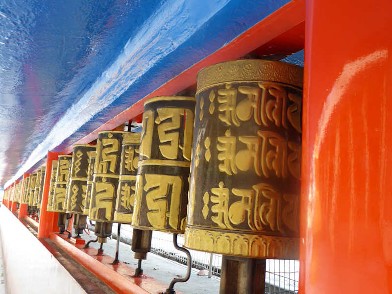 Nach unserem Besuch im Tibetology Museum machten wir noch einen Ausflug zu Fuß zur Do-Drul Chorten Stupa. Die goldene Kuppel vom Do-Drul Chorten Stupa ist fast von ganz Gangtok aus sichtbar. Der Do-Drul Chorten Stupa ist der größte Stupa von Sikkim. Der Do-Drul Chorten Stupa liegt auf eine Anhöhe und ist über einen kurzen steilen Aufwärtsweg in einigen Gehminuten vom Museum aus, zu erreichen. Der Stupa wurde von Trulshik Rinpoche (1923-2011) im Jahr 1945 gebaut. Der Legende nach, soll er diesen Stupa gebaut haben, um die bösen Geister von hier zu vertreiben. Trulshik Rinpoche war auch einer der Hauptlehrer des 14.Dalai Lamas. Im Inneren der Stupa befinden sich Reliquien bestehend aus einem Mandala Set des Dorje Phurba, einer Ausgabe der Kann-gyur Reliquien (heilige Schriften) und vielen anderen Objekten. Der Stupa war ursprünglich ein Grabdenkmal über der Asche eines prominenten Mönchs. Im Laufe der Zeit wurde der Stupa zu einem Symbol und Mahnmal der Buddhalehre. In Tibet heißen diese Reliquienschreine "Tschörten" oder "Chorten". Nach der Überlieferung hat Buddha selbst seinen Schüler Ananda angewiesen, Erinnerungsmerkmale für erleuchtete Wesen zu errichten. Als „Muster“ diente dabei eine umgedrehte Reisschale mit einem darin steckenden Wanderstab. Es gibt acht Kategorien von Stupas, jede dieser acht wird einem bedeutsamen Ereignis im Leben des historischen Buddhas Shakyamunis zugeordnet. Gangtok ist das Zentrum des tibetischen Buddhismus in der Region. Der Do-Drul Chorten Stupa ist von 108 Gebetsrädern umgeben, von denen alle Mantras auf Tibetisch eingeschrieben sind. Im Buddhismus werden heilige Sätze oder Silben als Mantras angewendet. Jeder Buddha wird über ein eigenes Mantra angerufen. Die Zahl 108 ist die heilige Zahl im tibetischen Buddhismus. So bekommt in Tibet eine Frau zur Hochzeit 108 Zöpfe geflochten. Es gilt als äußerst segensreich, eine Kora um die Stupa zu machen und dabei die 108 Gebetsmühlen zu drehen. Kora bezeichnet man im tibetischen Buddhismus die rituelle Umrundung eines heiligen Ortes, also eines Heiligtums oder eines heiligen Berges. Wenn man die Gebetsräder dreht, dann im Uhrzeigersinn. Unser indischer Reiseleiter hat uns sehr ausführlich von der tibetischen Buddhalehre in Sikkim erzählt.