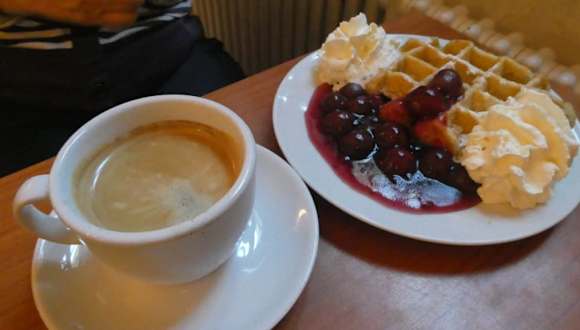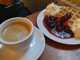 Nach einem schönen Gottesdienst im Berliner Dom ist uns beim Verlassen des Doms mal wieder das Dom Café aufgefallen, das sich im Untergeschoss des Doms befindet. Nachdem wir uns die nähere und auch die etwas weitere Umgebung erneut angesehen hatten, sind wir zurück zum Dom und zur Kaffeepause in das Dom Café, welches ein Selbstbedienungs-Café ist. Bei gutem Kaffee und Waffeln mit Kirschen und Sahne, konnten wir unsere Berlin-Besichtung gut gestärkt und ausgeruht fortsetzen. Das Dom Café verfügt über ca. 30 Innenplätze und ist somit ein recht kleines Café, bei schönem Wetter und entsprechenden Temperaturen kann man jedoch auch im Außenbereich (zwischen Dom und Schloßplatz) sitzen.