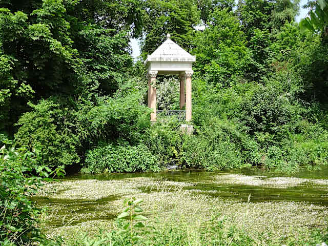 Anfang des 20. Jahrhunderts im antik-griechischen Stil an der Mündung des Donaubachs in die Brigach errichtet. Schönes Fotomotiv.