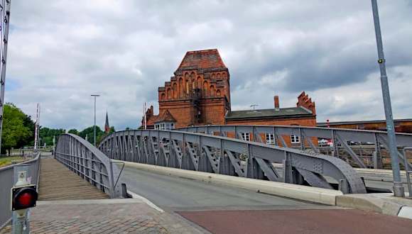 An der Untertrave liegt praktisch an der Willy Brandt Allee diese Brücke. Wenn Schiffe von der Trave kommend in den Museumshafen wollen, wird diese Brücke zu Seite gedreht, oder auch für Schiffe die auf die Trave bzw. nach Travemünde wollen. Gebaut wurde dieser Koloss von der Gutehoffnungshütte in Oberh.-Strekrade im Jahr 1892. Die Brücke ist ein geschütztes Denkmal, sie wird seit 2005 elektrisch betrieben. Über diese Brücke fahren täglich 17700 Kraftfahrzeuge.