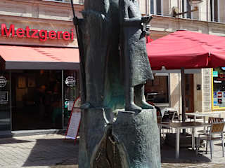 Der Brunnen wird umgangssprachlich wohl auch "Dreimännleinsbrunnen" bezeichnet. Es werden die früheren drei Herren der Stadt dargestellt - Bischof, Markgraf, Patrizier. Bei unserem Besuch war der Brunnen ohne Wasser.