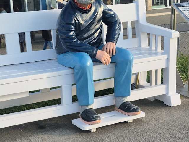 Auf dem Deich von Duhnen, oberhalb der Duhner Strandstraße, befindet sich eine Bank, die auf der Rückseite mit „Duhner Reichstag“ beschriftete ist – was mir als seltsam und eigenartig vorgekommen ist. So ging ich also hoch auf den Deich und schaute mir dies einmal näher an. Auf der Bank sitzt eine männliche, verschmitzt lächelnde Figur. Wie ich an der INFO-Tafel lesen konnte, die neben der Bank steht, ist dies Kuddel. Kuddel sitzt seit 2017 hier und er blickt auf den Strand und auf das Meer. Er erzählt den Menschen, die sich zu ihm setzen oder die hier vorbeikommen, die eine oder andere Geschichte. Aber warum steht auf der Bank „Duhner Reichstag“ geschrieben? Vor dem Rettungsbootschuppen am Strand von Duhnen stand in den 1920-er Jahren eine Bank, bei der sich vier ältere Männer trafen. Die Männer redeten, erzählten spannende wahre Geschichten, aber auch so manche spannende Fantasiegeschichte. Dieses Zusammentreffen der vier betagten, längst verstorbenen Männer nannte man bald „Duhner Reichstag“.