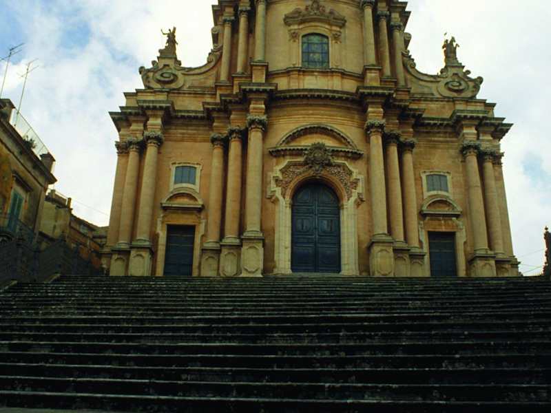 An der Piazza del Duomo von Ragusa erhebt sich die Kirche San Giorgio. Die harmonische Fassade aus rosafarbenem Stein zeig einem in flachen Bogen vorgezogenen und von Säulen eingerahmten Mittelteil