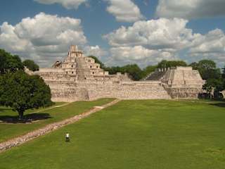 Edzná, 65 km südöstlich von Campeche gelegen, hatte seine Blütezeit zwischen 300 und 900 nach Christi. Vom Zentrum der Anlage ausgehend erschloss ein Kanalsystem die umliegenden landwirtschaftlich genutzten Flächen. Mittelpunkt von Edzná ist das etwa 20 Meter hohe "Edificio de Cinco Pisos", dessen Besonderheit eine wie ein Band über die Vorderfront gelegte Treppe mit Maya-Bögen ist. Zweimal im Jahr zeigen an drei Tagen (Aussaat und Ernte) die Sonnenstrahlen durch die Öffnung des Heiligtums im obersten Stockwerk auf eine Stele. Der im Süden liegende "Templo de los Mascarones" ist mit gut erhaltenen Stuckdarstellungen übersäht. Edzná vereint die unterschiedlichsten Baustile (Rio Bec, Chenes, Puuc) . Ein Großteil ist bis heute nicht ausgegraben.